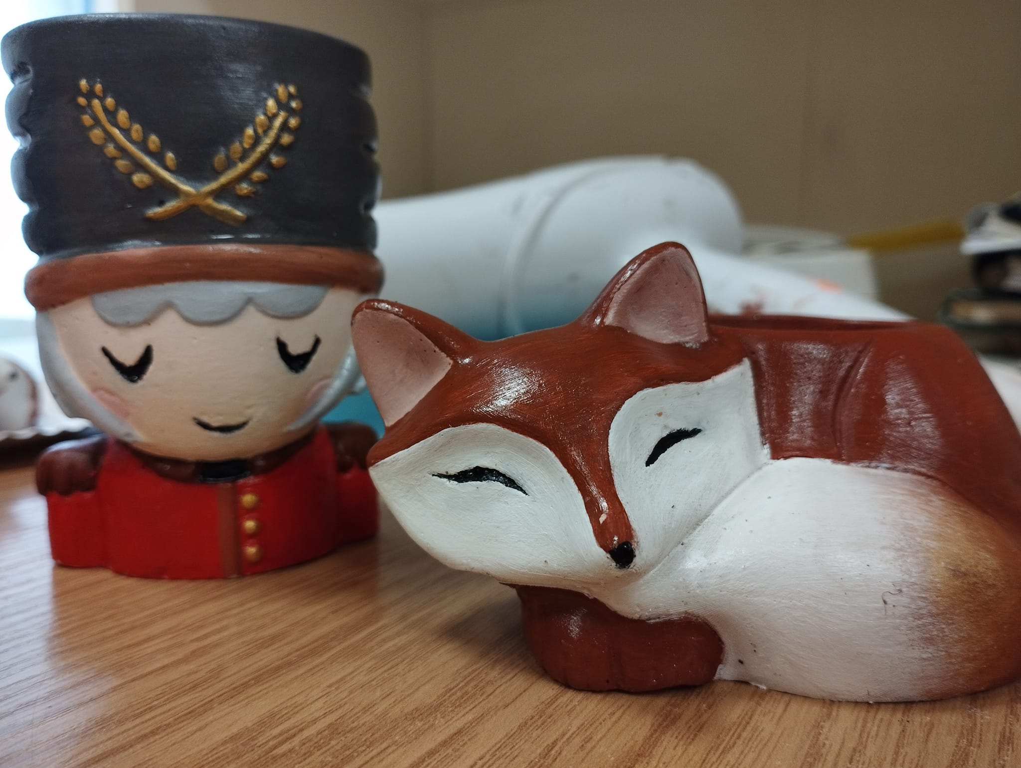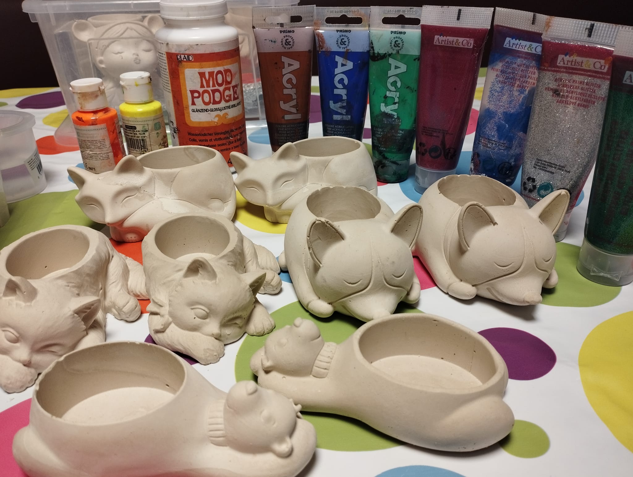 Podczas warsztatu dzieci dowiedzą się w jaki sposób pracować z gipsem oraz w jaki sposób wykonuje się gipsowe odlewy doniczek. Do wybory wiele form : dziewczynka z kotkiem, dziewczynka mickey mouse, żołnierz, pies, lis, kot, królik, formy świąteczne,